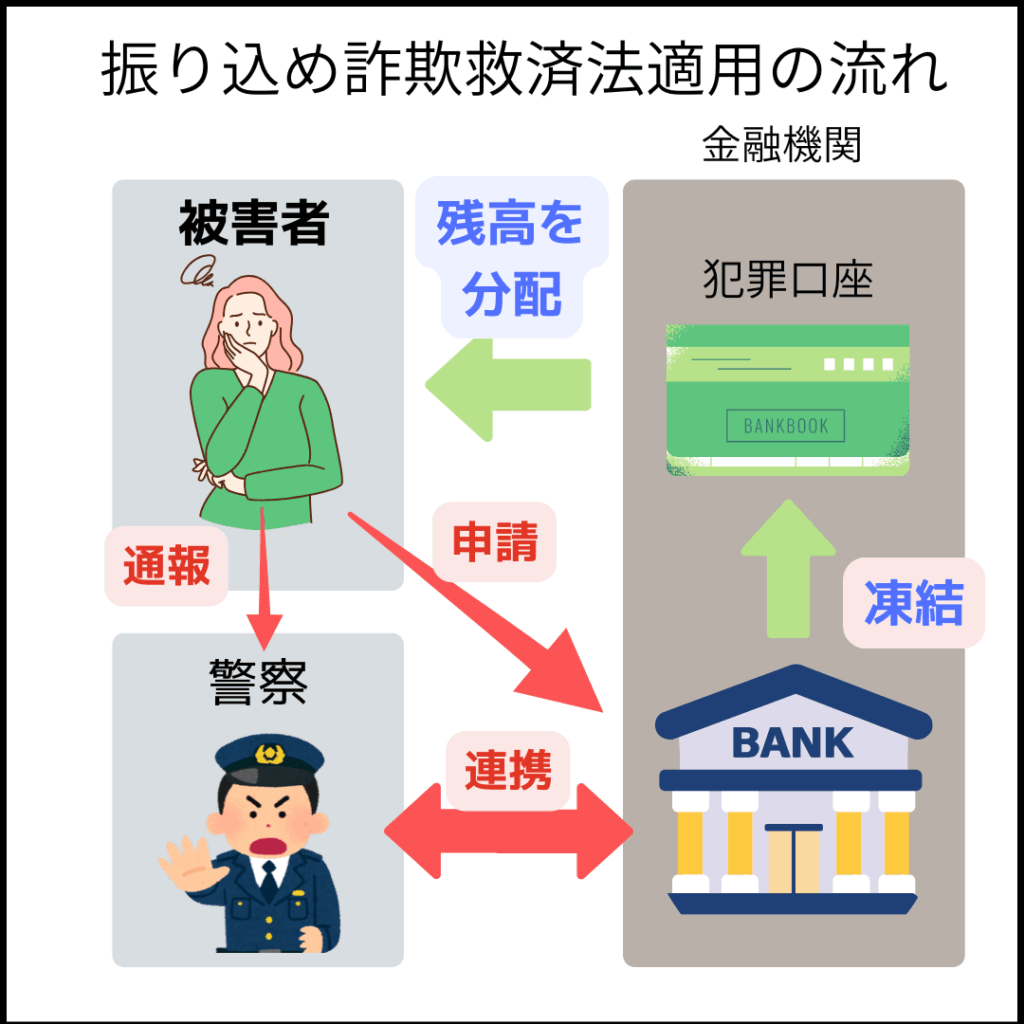 被害者は警察への届出とは別に、自ら金融機関に対して被害回復分配金の支払申請を行う必要があります。