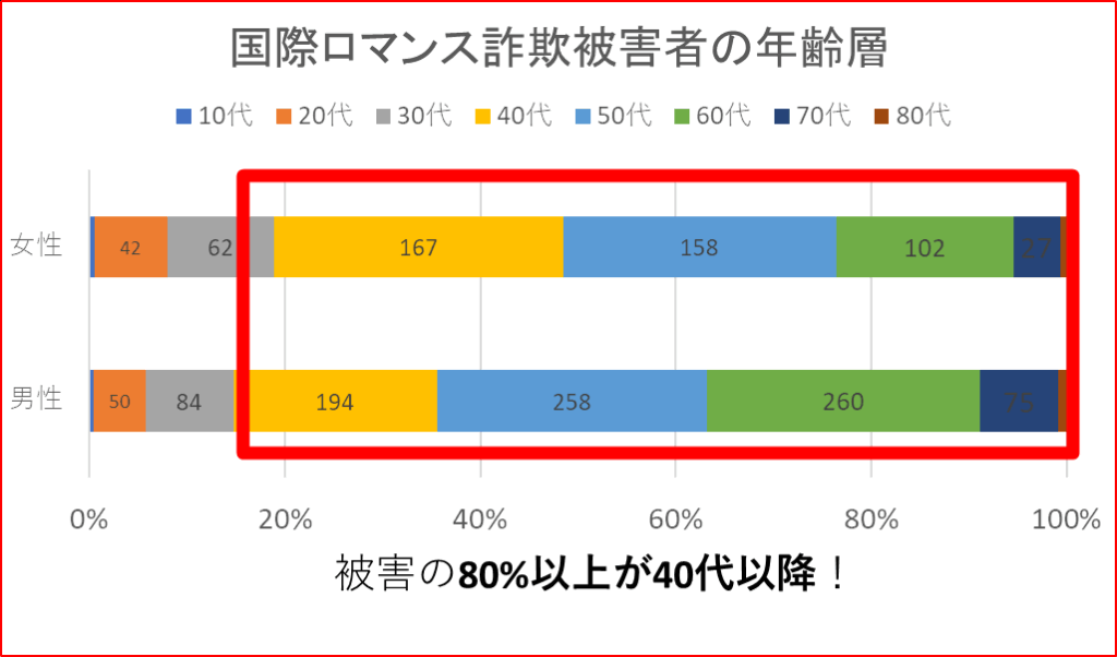 国際ロマンス詐欺の被害者のうち、40代以上が全体の80%を占めるという深刻なデータがあります。