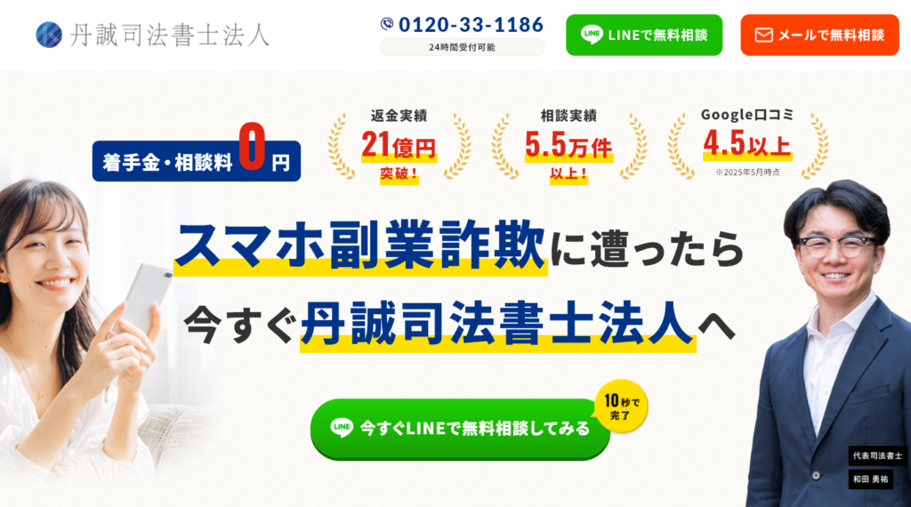 | 丹誠司法書士法人 | 公式サイトへ | 全国対応 | 着手金無料 | 365日24時間(LINE、メール) | 主に副業・投資詐欺 | LINE相談・スピード対応 | LINE/電話/メール |