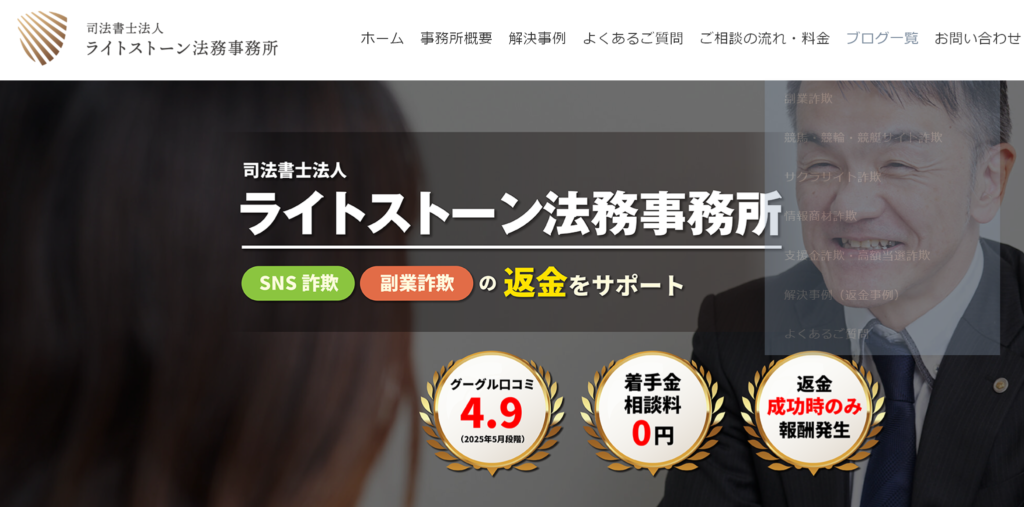 ライトストーン法務事務所は、副業詐欺や投資詐欺の被害回復に強い司法書士事務所です。